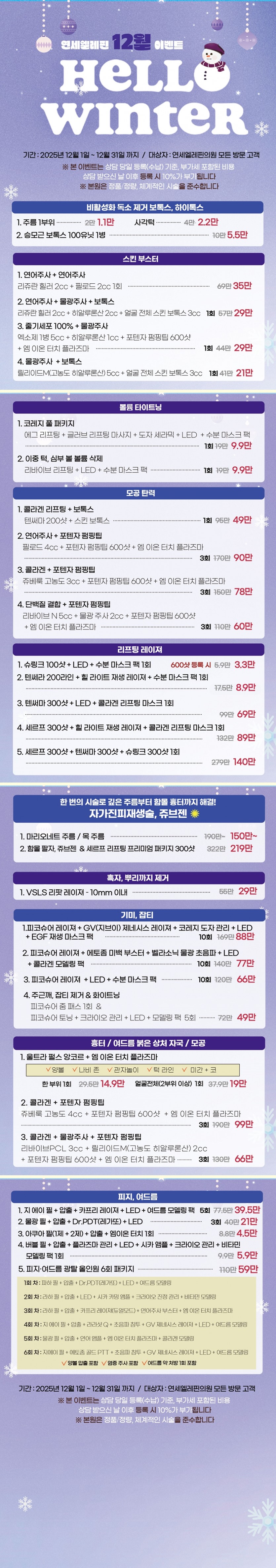 25년도 12월 겨울시즌이벤트 페이지 정보 작성자 최고관리자 댓글 0건 조회 1,073회 작성일 25-11-28 10:32 목록 본문 25년도 12월 겨울시즌이벤트 이전글25년도 겨울시즌 1회체험 이벤트 25.11.28 다음글연세엘레핀 1회 체험 이벤트 25.10.31 댓글 0 댓글목록 등록된 댓글이 없습니다.
