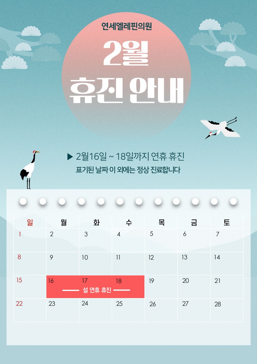 2026년 2월 휴진안내 페이지 정보 작성자 최고관리자 댓글 0건 조회 202회 작성일 26-01-30 13:27 목록 본문 2026년 2월 휴진안내 이미지 확인 부탁드립니다 이전글26년도 3월 휴진일 공지드립니다 26.02.26 다음글2026년 1월 휴진안내 (새해복 많이 받으세요) 25.12.26 댓글 0 댓글목록 등록된 댓글이 없습니다.